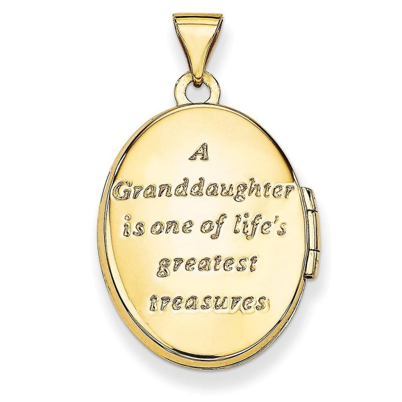 21mm Granddaughter Oval Locket in 14k Yellow Gold with Rhodium - 1.1 Grams in 14k Yellow Gold - Includes Gift Box - Width of Item: 17 mm - Length of Item: 28.2 mm - Bail Length: 5.7 mm - Bail Width: 4 mm - Finish: Polished - Feature: Opens - Feature 2: Reversible - Feature 3: Hollow - Engraving: Not Recommended - - This item does not include a chain