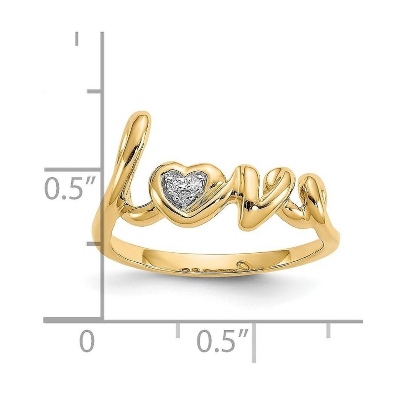 10 Carat 2mm Diamond Love Ring - Size 7.00 - 2.1 Grams - Diamond Weight 0.009 Carat in 10K Yellow Gold - - Ready to Gift Jewelry Box Included - Band Width: 2 mm - Width of Item: 2 mm - Ring Top Length: 10 mm - Ring Top Width: 17 mm - Finish: High Polished - Ring Top Width: 17 mm - Ring Top Length: 10 mm - ::: ::: [ Care & Handling: Diamond ] - Clean with warm soapy water and a soft brush or cloth. :::