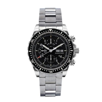 Marathon 46mm Stainless Steel Jumbo Pilot/Diver Automatic Chronograph (CSAR) Watch The 46mm Jumbo Pilot/Diver Automatic Chronograph (CSAR) watch is commonly referred to as the Search and Rescue (CSAR) chronograph and is the most coveted in our SAR class. It is considered the “Holy Grail” of our timepieces and is the perfect choice for those who demand the very best in terms of quality and performance. Featuring a 25-jewel automatic chronograph movement accurate to 1/5 of a second, the stopwatch function uses 1/100th-minute decimal timing for use in flight logs and fuel consumption tracking. The watch can track elapsed time up to 12 hours, making it the ideal choice for pilots and divers. The movement is powered by an ETA Valjoux 7750 with Incabloc® shock absorber, ensuring reliable and accurate timekeeping in all situations. The watch also features a calendar with day and date. For easy reading in low-light conditions, the CSAR features tritium gas tubes and MaraGlo™ illumination functions. The crystal is sapphire, making it scratch-resistant and durable, while the screw-down crown guarantees water resistance to 30 ATM. The case and bracelet are made of 316L stainless steel and finished with a brushed texture, giving it a sleek and modern look. The unidirectional bezel has a 60-minute scale, and the watch has a 30 ATM dive rating, making it perfect for scuba diving and other water activities. The watch has a case diameter of 46 mm, a case thickness of 18 mm, and a lug width of 22 mm. Movement: ETA Valjoux 7750 with Incabloc™. Shock Absorber