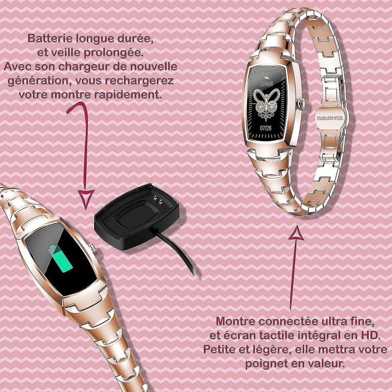 Smart Watch & Health Tracker This smart watch allows you to accurately record all-day activities, such as steps, distance traveled, calories burned, heart rate, sleep status, and much more. This smart watch supports multiple sports modes. Something to keep you motivated all day long. This smart watch is a great gift option. Call & Message Notifications These smart watches (rose gold or silver) will vibrate when you receive incoming calls or messages (Facebook, Twitter, WhatsApp, Line, Skype, Twitter, WeChat, etc.). You will be able to see the message content directly on the watch. If you are busy, you can hang up the call directly. These stylish, high-tech IP67 women's watches have the smartest features on the market, such as synchronized weather forecasts, sedentary reminders, a vibrating alarm clock, full music and camera control, and control your phone through the watch screen, a stopwatch, brightness adjustment (raise your wrist to brighten the screen), magnetic fast charging, and more. More than just a women's watch This smartwatch uses a 1.09-inch (2.54 cm) IPS HD touch screen and is made of stainless steel to give you a better experience - all for a stylish look. Blood pressure, blood oxygen levels and menstrual cycle are also part of this watch's applications: you will have complete monitoring. Long battery life and wide compatibility The women's Bluetooth watch is compatible with Android 4.4 or IOS 8.0 and above (Bluetooth 4.0 or above is required), it is only suitable for smartphone connection, not for PC, iPad, tablet. Scan the QR code or download/install the "F Fit" APP from your mobile app store. Open it and turn on Bluetooth. Click "Add device" and select the watch. Enjoy