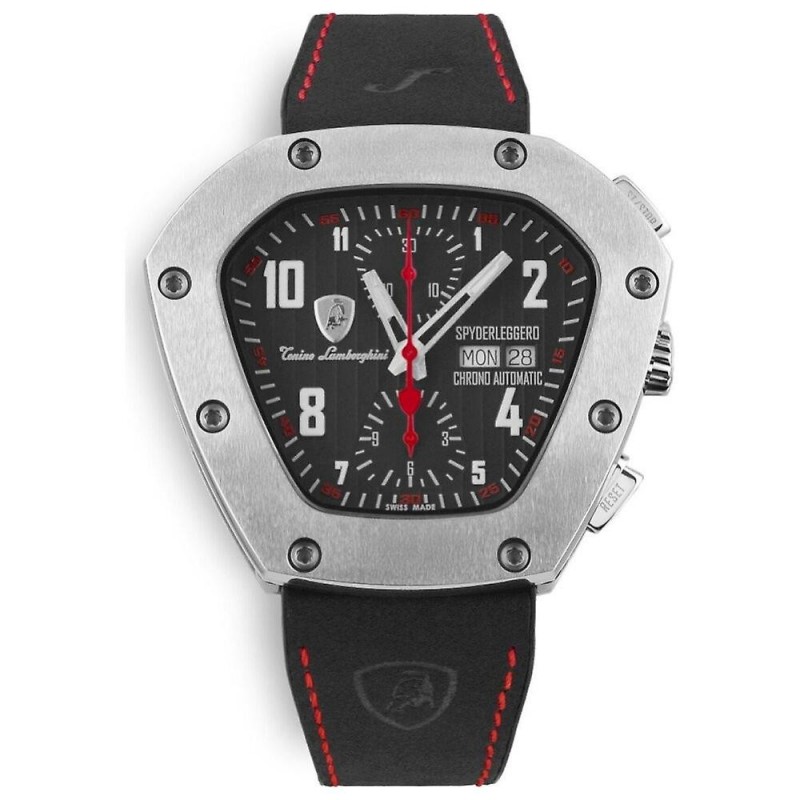 Brand: Tonino Lamborghini Target Group: Men Case Color: Silver Crystal: Anti-reflective Sapphire Bracelet Material: Leather ? mm: 51x46 Case Material: Titanium Dial Color: Black Display: Analog Strap Color: Black Product Group: Watches Functions: Date Display Watch Type: Automatic Movement Type: Automatic Water Resistance: 10 ATM